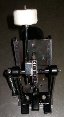 The design of this musical robot started with a request from Aphex Twin. After some exchange of ideas, we agreed to undertake the task of designing a musical robot that could be used to strike just about anything. For technical and physical reasons however it is impossible to realize this in its full generality. The mass of the striking object always has to be in proportion to the mass as well as the magnitude of the spring-force behaviour of the object struck. Big objects require big beaters to obtain a big sound, put it simple words. Hence in our design we decided to foresee a variety of different beaters and mechanisms such that for a wide variety of objects, a suitable beater can be found in the robot. A strict condition for the robot to function properly is that the object struck should always be clamped ridgidly to the structure. If the struck object is allowed to move even slightly, precise control of the striking forces and hence of the musical dynamics, becomes unpredictable if not impossible. The largest beaters are driven by very large and heavy solenoids driving a bass-drum kind of mechanism. They can be used for objects such as gongs, bass drums, heavy metal plates etc. These mechanisms are mounted near the base of the robot on both the right and left sides. The traditional footstepplate disappeared altogether in our pedal design, where the solenoid pulls the chain driving the rotating beater mechanism directly.