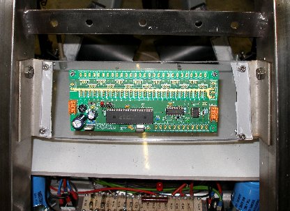 The entire circuitry for this robot makes use of a few fast PIC controllers: One Microchip PIC 18F2525 and one Microchip PIC18F4620 - I/SP types. The timing resolution, essential to obtain a good velocity sensitivity, is extremely high (in the order of 20 microseconds). The circuits are visible in the robot assembly but protected with a transparant polycarbonate cover. To remove dust from the circuits, compressed air (2 Bar pressure is enough) should be used.