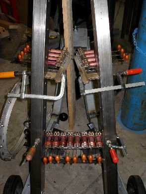 Also on the bottom structure we mounted two rotary solenoids to be used for objects/instruments placed on the floor. Two 'hands' with four 'fingers' each are designed to make very fast rolls possible. These mechanisms are mounted on adjustable slides in the upper part of the robot. They are similar in function and operation to the beaters we designed for <Snar>, our snare drum playing robot.