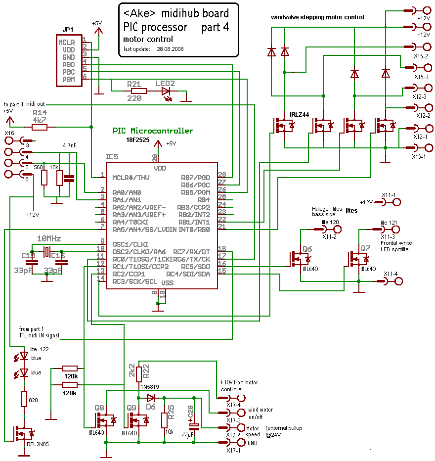 The schematic for the first PIC, with three latch and mosfet boards to drive