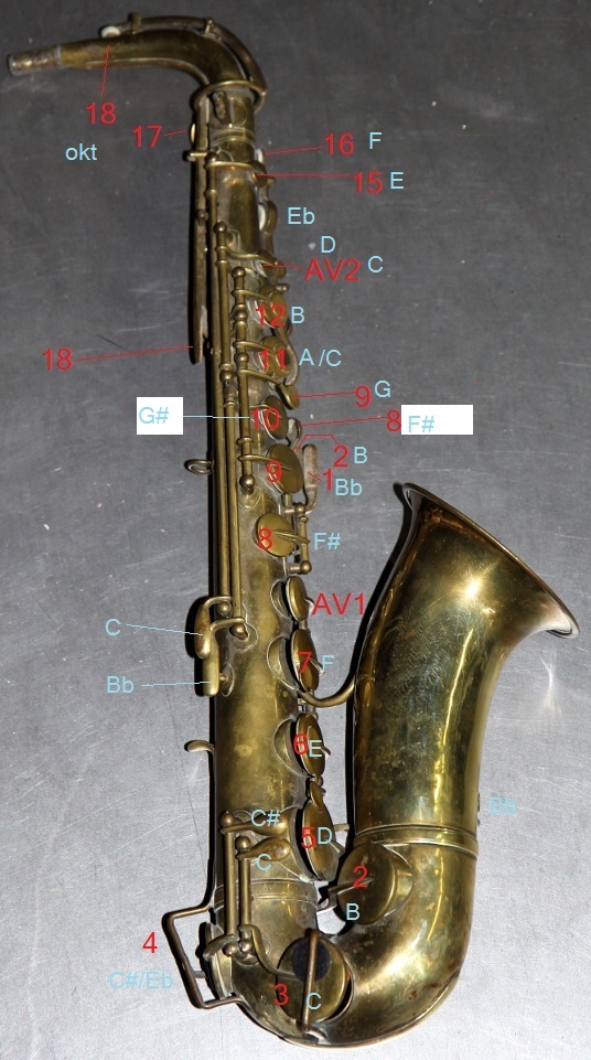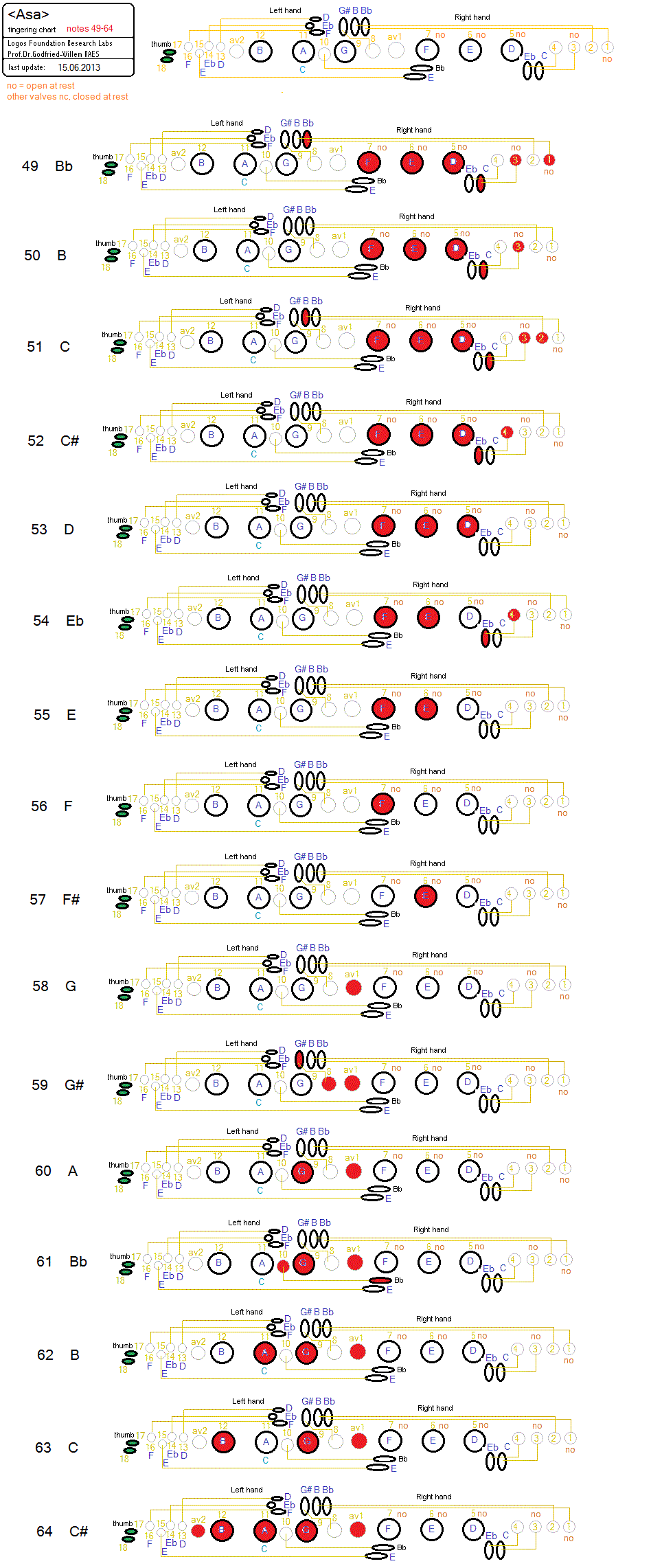 Fingering table for the low octave, notes 49-64 (Bb to C# for saxophonists):