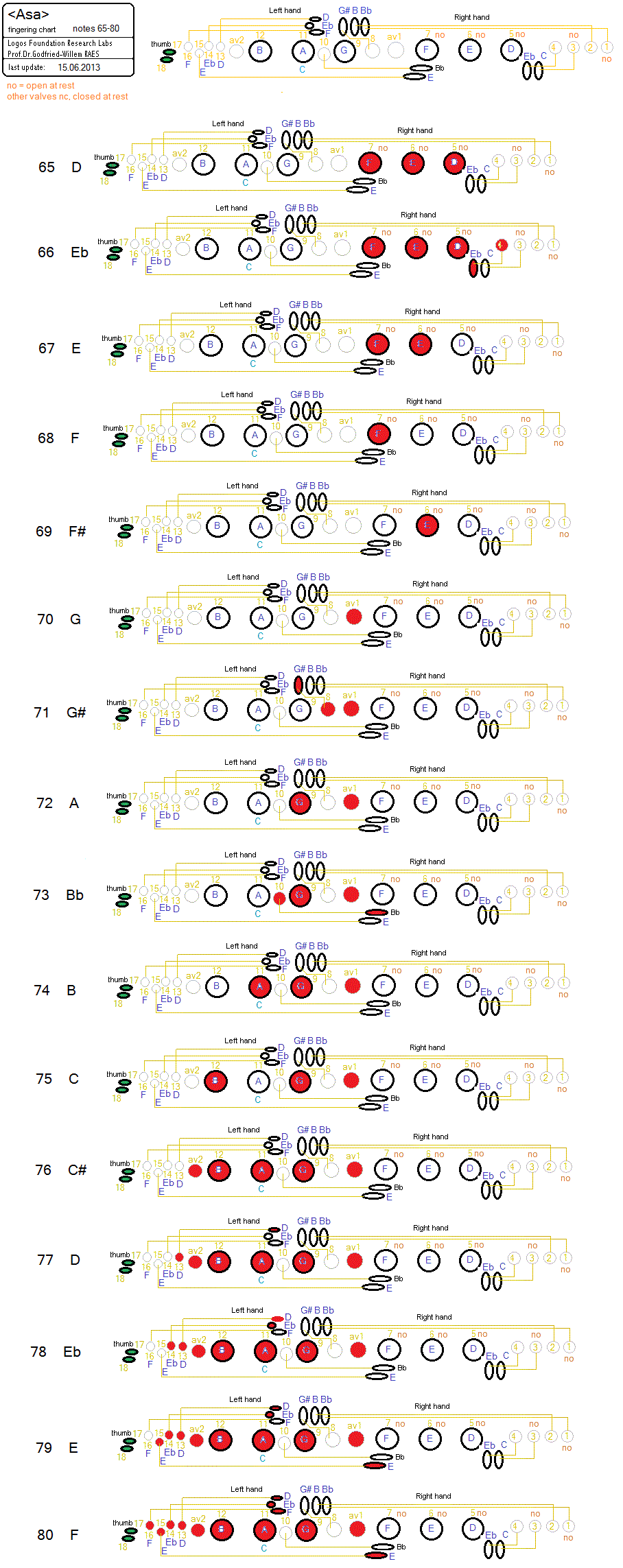 Fingering table for the second octave, notes 65-80 (Bb to C# for saxophonists):