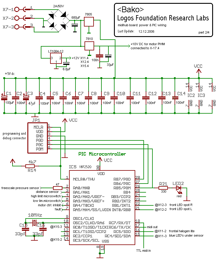 Circuit drawings for the midi hub board carrying the motor control PIC: