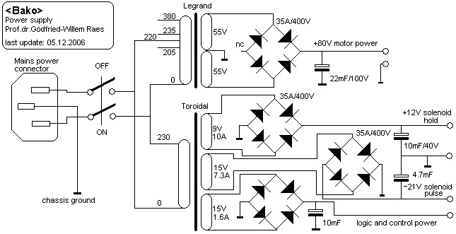 - Solenoid power supply: toroidal transformer 225VA, sec.: 9V/10A, 15V/7.3A,