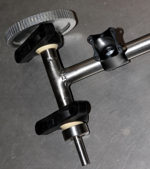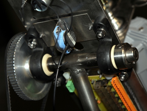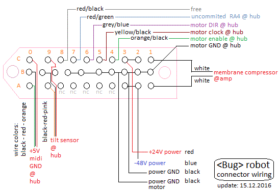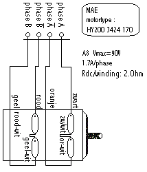 High brass instruments in their normal human and musical biotopes tend to move quite a bit in space. The highly directional characteristic of these instruments make this also an expressive valuable parameter. Thus we tried to implement movement in two degrees of freedom in this robot: the flugelhorn can be tilted in the vertical plane over an angle of about 90 degrees and in the horizontal plane, it can rotate over nearly 320 degrees. This conforms pretty well to what human players do in terms of movement on stage. The movements cannot be very fast however, at least not much faster than what a real flugelhorn player could do whilst playing. Horizontal movement is faster than the vertical movement, the forces involved in horizontal movement being much smaller than in the case of vertical movement. However, the intention never was to render Doppler effects possible... Note that on a cold boot, the robot will always perform a calibration of its movement. During this calibration phase the red light on the hub board (the board with the MIDI connectors) will be on and the robot will not be listening to any midi commands sent to it. Before switching the power on, make sure the robot is in a more or less central position, both vertically (pointing straight forward) and central horizontally. As long as power is switched off, the positions can be adjusted manually. Never ever do this when the power in switched on, as this will confuse the firmware and cause forcing on the motors excerting braking force against movement.