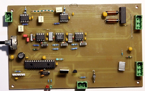 4. Sound generator board: This board steers the 75 Watt motor compressor horn driver via an audio amplifier module. A 16-bit processor is used to generate the required waveform and two analog multipliers are used for envelope shaping and amplitude modulation. Thus we could maintain audio resolution even at the lowest soundlevels. Handling this in the full digital domain would have required a 32-bit processor. The analog dynamic formant filter also found a place on this board.