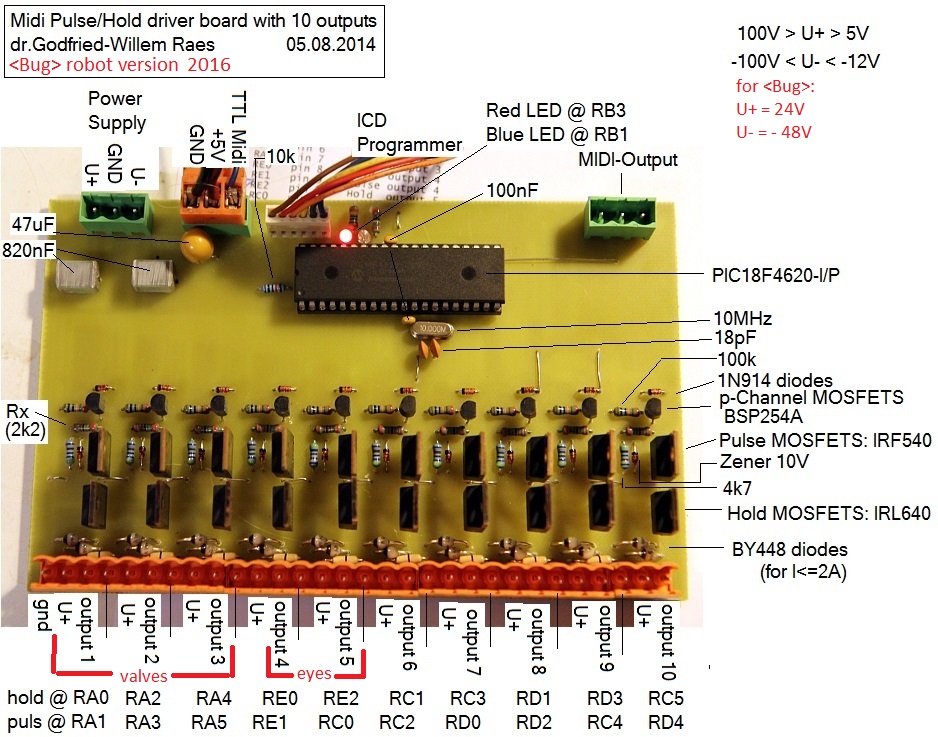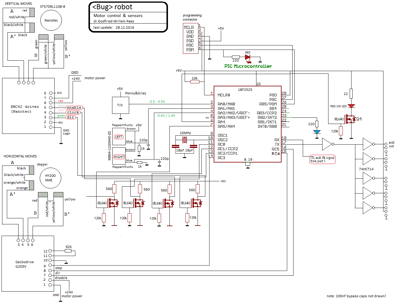 1. Midi-hub board: This board, using a Microchip 18F2525 controller, takes care of the Midi I/O handling and communication as well as the control of all movements: horizontal stepping motor with two end sensors (Pepperl+Fuchs) , and vertical stepper motor with tilt sensor (Penny & Giles). Circuit details, including the PCB design, can be found at the very end of this webpage.