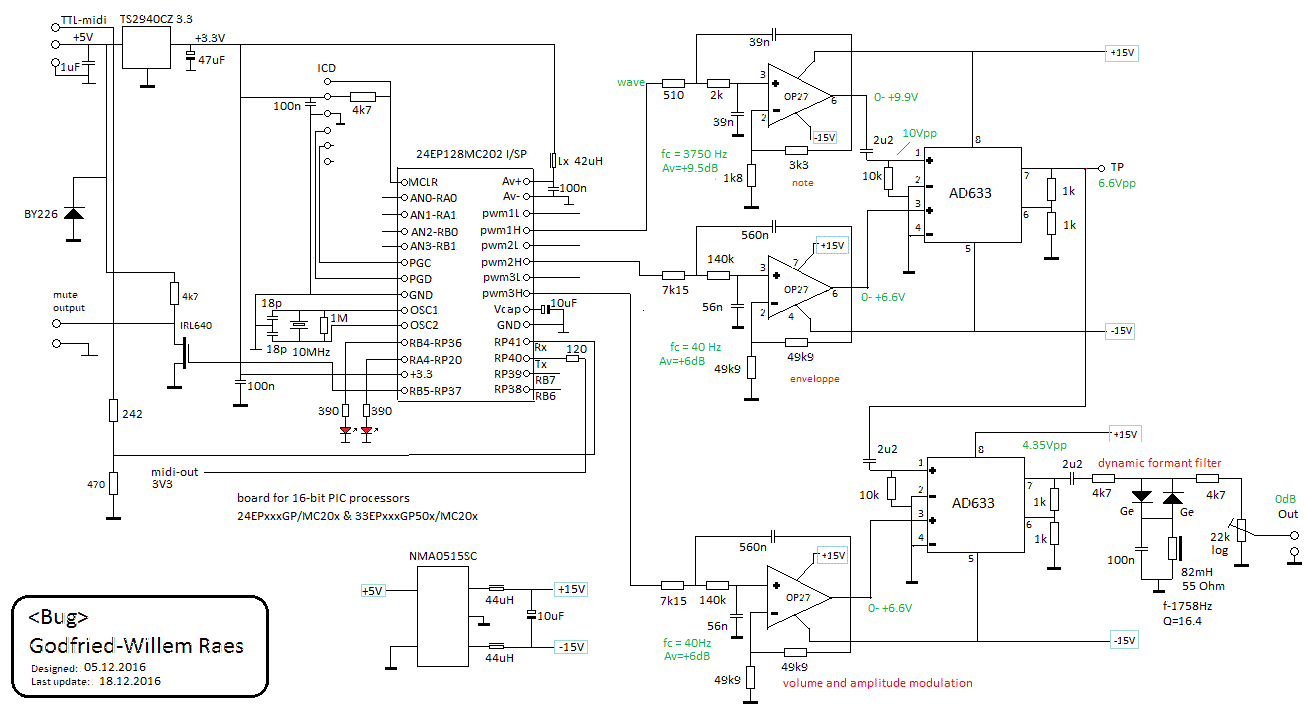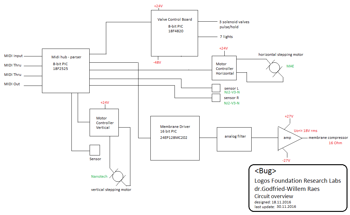 Thus it made sense to start the design of this robot by examining the <Korn> robot and improving over it where ever possible. Main improvements we envisaged were the sound volume, the attack characteristics and the speed of response. For the <Bug> design, we did not start with a mechanical design for an artificial embouchure with mouth, lips and mouthpiece coupled to and in acoustic interaction with the tubing of the instrument, as we did in <So> and the first version of <Bono>, but rather used a membrane compressor directly coupled to the flugelhorn via a capillary comprised in the original mouthpiece.The motor driver causes resonance in the flugelhorn tubing, but in this case there is no unidirectional windflow through the instrument. When a note is requested from the bugle, the firmware will calculate the optimum valve combination -including non orthodox fingerings- for the requested pitch. Thus a resonant standing wave in the instrument can be produced. Microtonal pitches are implemented such that the instrument is capable of performing quartertone music, as well as a wide range of different tunings and temperaments with great perfection. The relatively low Q-factor of the horn (compared to strings...) as an acoustic resonator renders this very well possible. The signal generated in the motor was shaped after a physical model of the air pressure waveform in the mouth cavity of a player. (Beauchamp, 1975,1980). Since there is no loop coupling from the resonator to the generator, the sound generation mechanism is a hybrid somewhere between synthetic/electronic and natural/acoustic. The advantage being that the reliability of the robot becomes very high, but this is obtained a bit at the detriment of realism, in particular with regard to the onset of the sounds, A dynamic formant filter was added using an electronic circuitry, in this case a pair of germanium diodes in series with a resonant LC circuit Thus the sound color will be to a certain extend a nonlinear function of loudness, conform to acoustic reality.