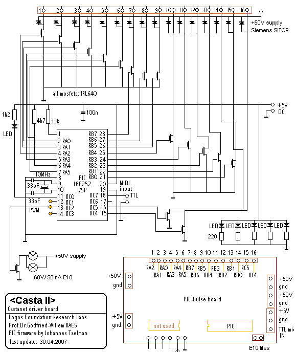 De elektromagneten voor de castagnetten komen van de firma August Laukhuff. Voor de castagnetten werden in <Casta 1> Laukhuff pallet magneten 12V/150mA gebruikt. Wij sturen ze, voor uitsluitend puls bedrijf aan op een voedingsspanning van 24V. De maximale piekstroom die dan kan lopen, wanneer alle castagnetten op hetzelfde ogenblik zouden spelen, is 4.8A. Mits een bufferelko van 10mF wordt toegepast, kunnen we in de praktijk alle muzikale mogelijkheden voldoen met een voeding van 24V/50W.