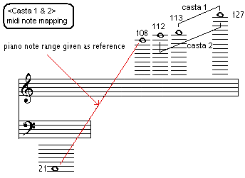 It is recommended to allways use program change 122, wich has an optimised mapping. Higher program changes contain test mappings.+ CHANNEL PRESSURE 208 + k Not implemented No PITCH BEND 224 + k Not implemented No SYSEX used for uploading lookups for 8 different programs (1-8) with velocity mappings for the castanets. (<Casta>) + 241 and higher Not implemented no real time msg's No Compositions for the Casta Robots: