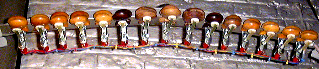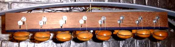 Here the lower halves of the castanets are pushed against the upper halves by levers and felt covered pushers driven by solenoids. This mechanism works pretty well but suffers a bit from a lesser than possible dynamic range.