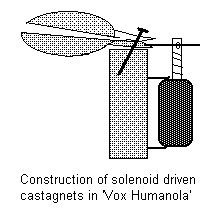 Op het eerste gezicht kan het automatizeren van zo'n ogenschijnlijk eenvoudig slaginstrumentje als de castagnet welhaast triviaal lijken. Zoals vaak is ook hier evenwel schijn erg bedrieglijk. Onze eerste pogingen om de klus te klaren dateren van 1996. Toen bouwden we een castagnet module bestaande uit acht castagnet paren aangedreven door trekmagneten. Ons eerste bouwsel zag eruit als in volgende schetsen en fotos: