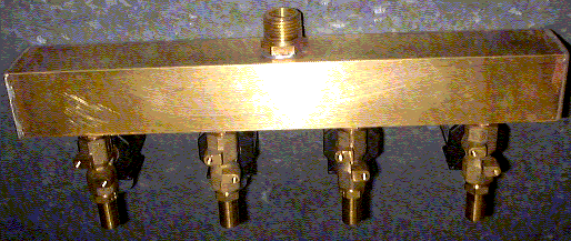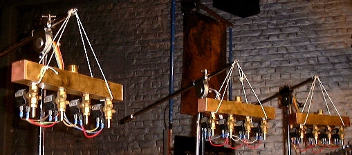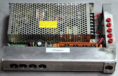 <Dripper> consists of three to four modules, each with its own reservoir and with four solenoid valves. The modules can be placed on high boom stands, or simply suspended. They connect to the circuit boards with special 5-wire conductor cables and connectors. All structural elements that can come in contact with the liquid used are made of copper or brass. Thus no rusting can occur. The liquid filling hole, on top of each module, is equipped with a standard 1/2" gastube thread. Thus, if required, extra liquid can easily be fed into the reservoirs.