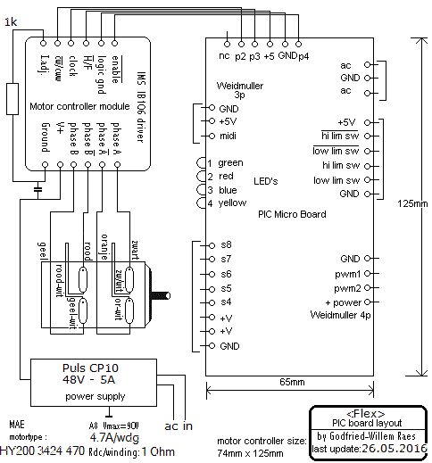 6. Stepping motors: MAE HY200 3424 470 A8. Current: 4,7 A/phase, 8-wires. Holding