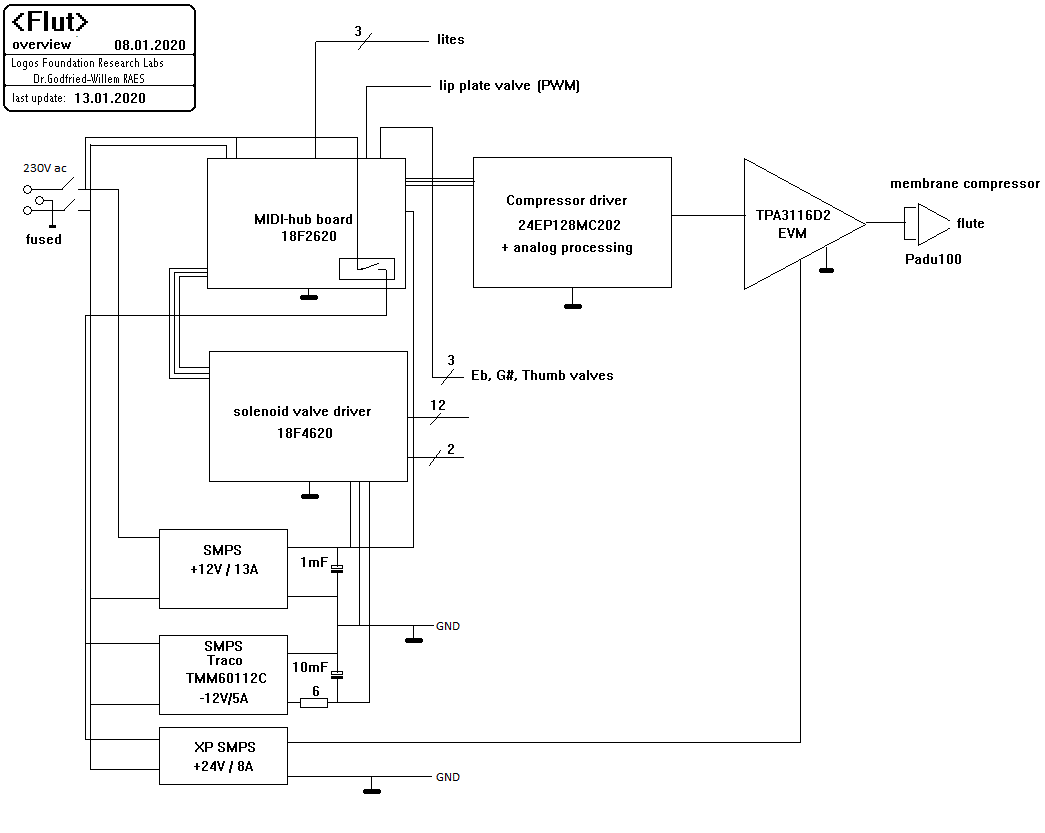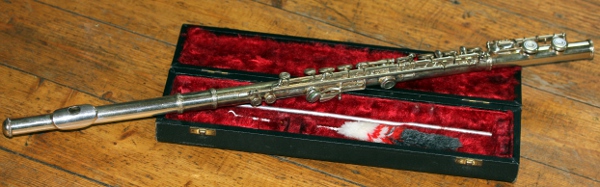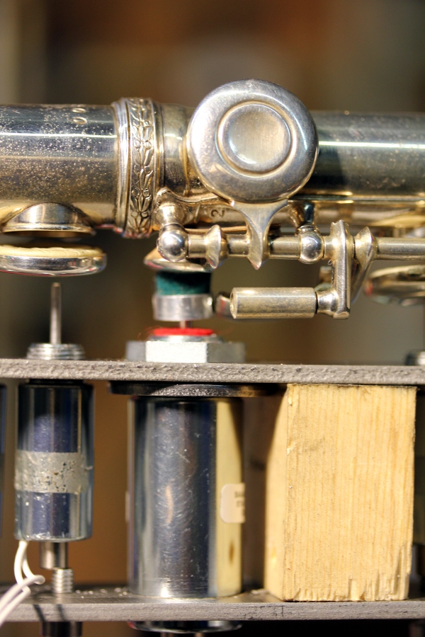 Het lag nooit in onze bedoeling een dwarsfluit te automatiseren. Pogingen daartoe werden al ettelijke decennia geleden ondernomen o.m. door mijn vriend en kollega Martin Riches. Bovendien bevat het robotorkest eigenlijk al vrij veel met labiaalpijpen opgebouwde orgels, waardoor het ontbreken van een fluit in het orkest niet echt als een gemis werd aangevoeld. Op mijn 68ste verjaardag echter, kreeg ik van Lara Van Wynsberghe toch wel een dwarsfluit kado. In redelijk goede staat nog wel, een eenvoudig instrument van Rampone & Cazzani gebouwd in Milaan. We begonnen het toch weer te overwegen... Vooral ook, omdat door de toevoeging van een heuse dwarsfluit aan het robotorkest, we afgezien van de strijkers, daarmee alle instrumenten van het symfonisch orkest zouden hebben geautomatiseerd.