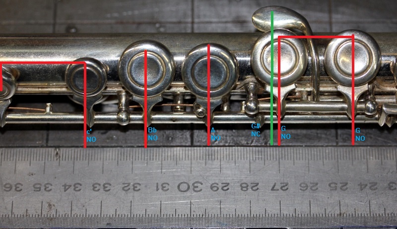 We zagen af van het automatiseren van de trillerkleppen voor re en re# in het tweede oktaaf omdat een zinnig gebruik daarvan vergt dat we vooruit kunnen kijken in de te spelen muziek, iets wat voor een real time robot vrijwel onmogelijk is. De kleppen voor Eb en G# zijn (naast de niet als dusdanig geimplementeerde, maar wel geautomatiseerde trillerkleppen) in rust gesloten. Alle andere zijn open in rust.