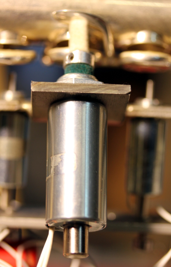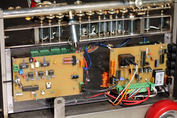 As to the valves, the task was much easier to accomplish. Fingering on wind instruments is a problem we already solved to great perfection in our robots <Fa>, <Klar>, <Ob> and <Asa>. The only problem here is that the response time of the solenoids used for the fingering is in the order of 5 to 10 ms, whereas the membane compressor reacts in about 1 ms. If we wanted to automate this to perfection, we should find a way to delay the commands for the membrane compressor, such that the resonance in the tube only occurs after the fingering allows it. In this robot we first went only one step in this direction, by sending only parsed midi to the membrane driver, whereas the solenoid driver board is steered by the command directly. However, the gain was only about 1 ms... Later on, we developed the software such that the delay time is a function of context and fingering: for repeated notes using the same fingering, a delay is not required. Neither is it required for full legato playing. As the robot cannot look ahead into the music, we implemented legato playing only for successive note-on commands, without corresponding note-off's. Most commercial sequencer software does not allow this however. The build-in delay time on successive notes requiring different fingerings is now 7.5 ms.