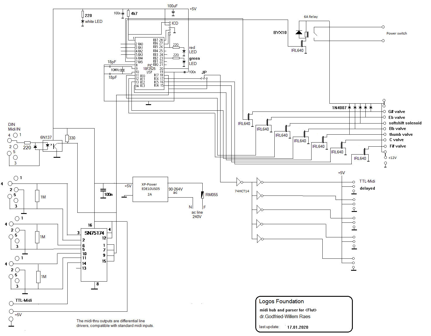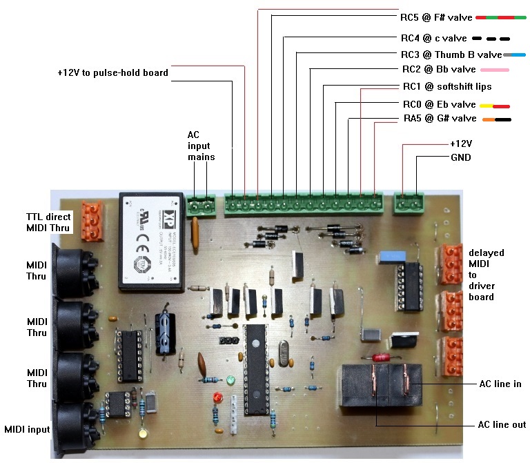 A midi-hub board is used to implement the delay-times for buffered and parsed midi, for the valves not requiring the velocity control and for the softshift solenoid used for the silicone lips. This board also houses the power relay steered by controller #66. Here is the circuit: