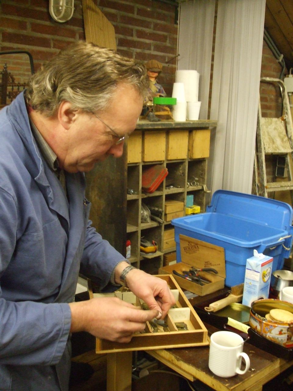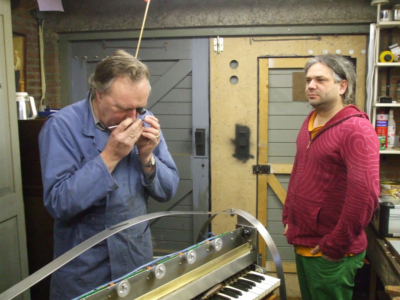 Today Yvan Vander Sanden and I transported <HarmO> to Schüller Harmoniums in Woerden, NL. There expert harmonium restorer Arie Schüller examined and fixed or replaced each reed we had identified as not sounding, sounding improperly, or being out of tune. He was able to fix, tune, or replace approximately 50 reeds, with the exception of the highest notes in the 4’ register, which refused to be tuned and for which he possessed no compatible replacement reeds. In the process Arie graciously shared his knowledge of reed tuning.
