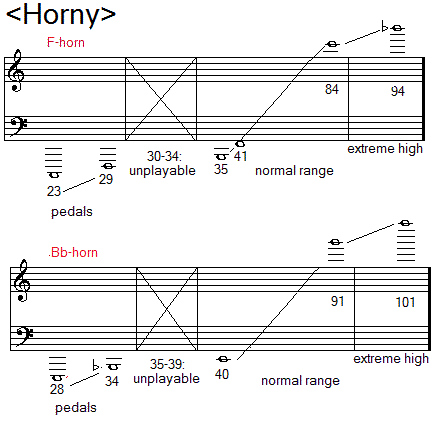 Midi note range: (23-29), 35-94 if used as an F-horn with the appropriate crook