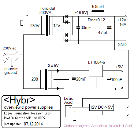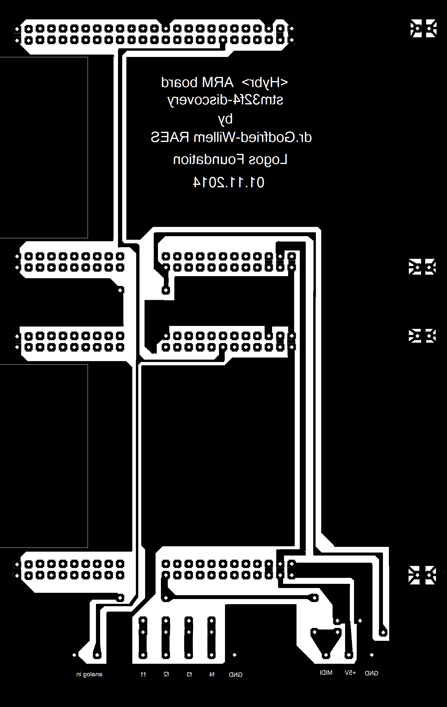 17.12.2014: A check of the voltages revealed a flaw in our design: the 5 V power supply is clearly underdimensioned now, as with all ARM boards working, the voltage sinks down to 3.5 V with shaky behavior for the midi signal levels as a consequence. We will have to replace the 15 VA transformer for the 5 V power supply with a 30 VA type. For test, we replaced the 5 V power supply by a Traco SMPS module capable of delivering 6 A. Indeed, now it works... All notes on Hybr do play now, but there will be still lots of fine tuning in the Axoloti patches required. First preliminary presentation and demonstration of <Hybr> under gesture control by the author at the occasion of the 'Snow' production of the robot orchestra.