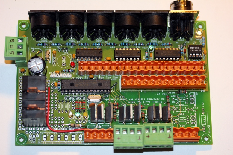 Removal of the midihub board, holding the 18F2525 processor is possible without removing any bolts other than the M3 bolts wherewith the board is mounted on the side panel. First remove all Weidmueller connectors from the board and make sure to note the place where they should go back before loosening any of these connectors.