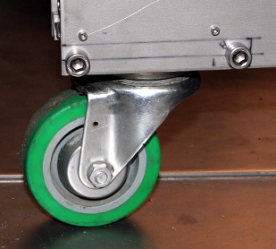 05.10.2025: <Hybr> returned from the palaver production in Brussels, Flagey. One of the green polyurethane wheels (Blickle) ruined through aging. The polyurethane found to be disintegrating. We replaced the wheel, but unfortunalety the replacement is just as old as the one found deteriorated. As <Hybr> was transported flat, we found the central axle displaced. This had to be done, but we need a couple of helping hands to do this...