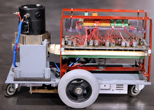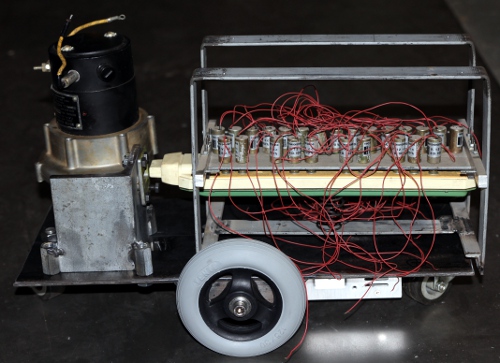 Een beetje als grap bouwden we deze hele automaat aanvankelijk zo dat hij in een 19" rack paste. Als een heuse akoestische midi synth dus. Bij de ombouw, een eerste keer begonnen in 2007, viel een en ander echter toch wat groter uit, alhoewel we hem ook toen nooit een volledige afwerking gunden. De konstruktie met de balgen bleek niet erg betrouwbaar en was bovendien behept met vele mechanische bijgeluiden. Toen we in 2017 helemaal zonder financiele steun kwamen te staan, haalden we het instrument vanonder het stof en beslisten we het alsnog af te werken. Met iets meer aandacht voor de vizuele vormgeving deze keer. De konstruktie met de dubbele balg lieten we geheel weg wegens veel te groot, en werd vervangen door een kleine radiale kompressor aangedreven door een universele kollektormotor. Deze motor van Amerikaanse makelijk -wellicht afkomstig uit een vrachtwagen- maakt meer lawaai dan wenselijk en mogelijk is, maar deze robot werd afgewerkt op het moment dat we helemaal zonder steun en subsidie kwamen te vallen waardoor we ons geen betere motor meer konden veroorloven. Alles diende te worden uitgevoerd met onderdelen die we nog op voorraad hadden of konden recycleren. Vandaar dat we voor de motor besturing een board recycleerden dat we oorspronkelijk hadden ontworpen voor de Propeller-1 robot in het Balmec projekt. In een verre toekomst kan altijd nog een kleine en stille radiale kompressor toegepast worden...