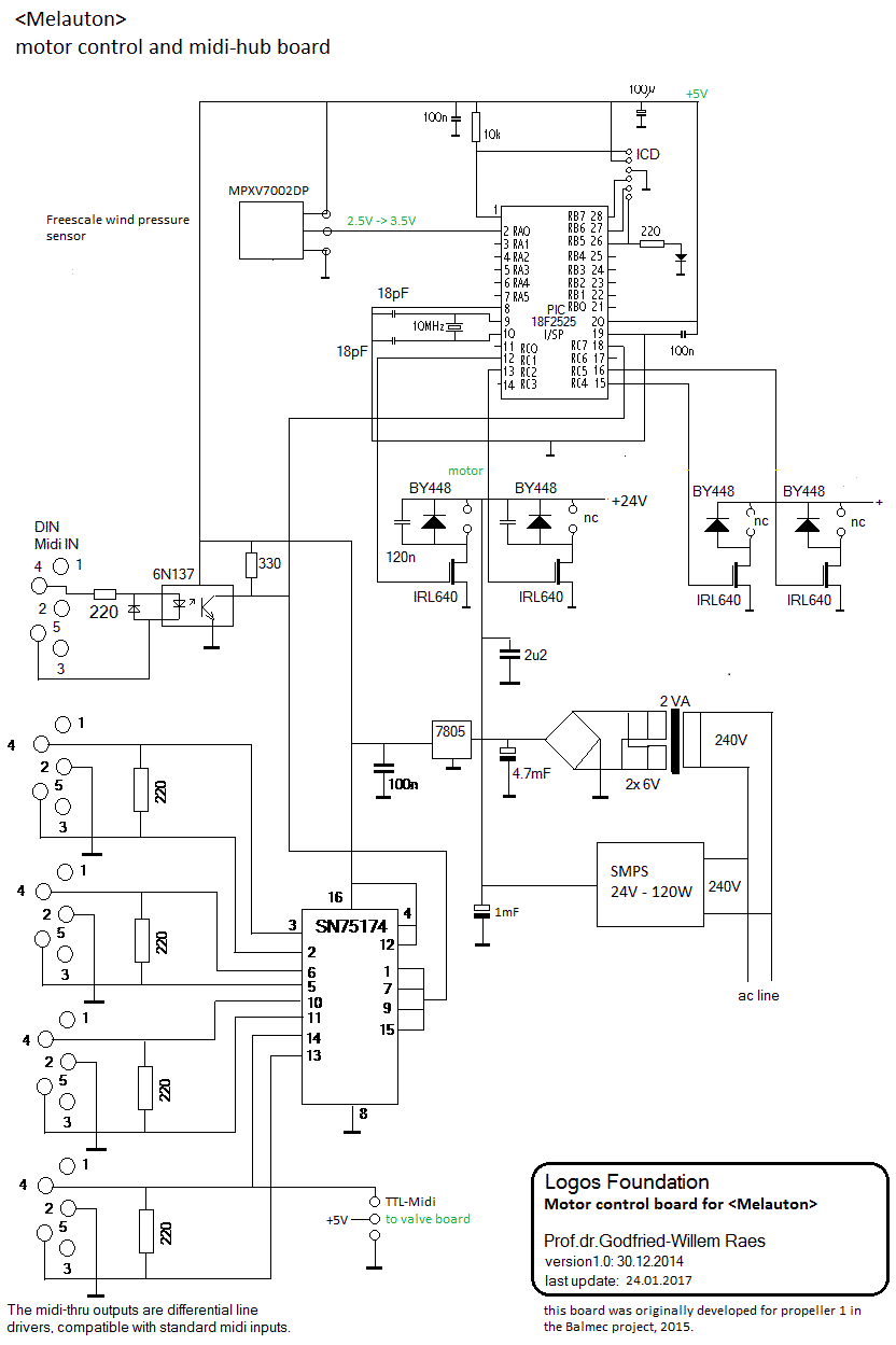 The wind control for the motor takes into account the pitch as well as the number of notes to be sounded, combined with a global setting for the volume control. Note that the lowest note requires about four times more air than the highest note, two octaves higher. When no notes are sounded, the motor will switch off automatically. A freescale air pressure sensor is used to control the required pressure in a PID regulator arrangement. Operation of the motor can be controlled with controllers #7 and #68, #69 and #70, as documented below. The prefered setting for controller 68 is 9. With this setting, the sensor has no function at all and thus the algoritm implemented relies purely on measurements and tests performed on the actual robot.