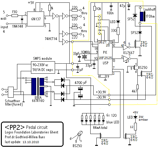 As an extra feature two lights are mounted in the pedal robot The blue LED light is mapped on note 127 and the amber light on note 126. The lights can be made to flash if a note pressure command is sent via midi. The value of the pressure byte determines the flashing speed. A note off command will dim the light and stop the flashing. Note that we used low voltage P-channel power mosfets for the lights here!