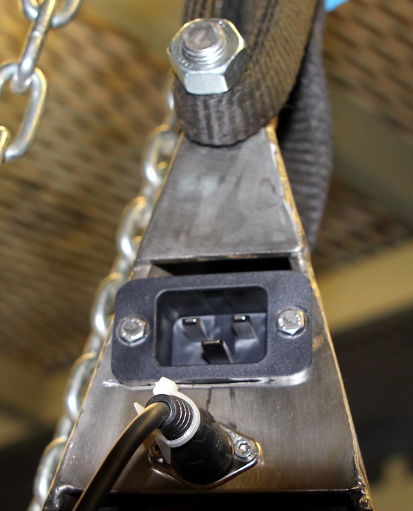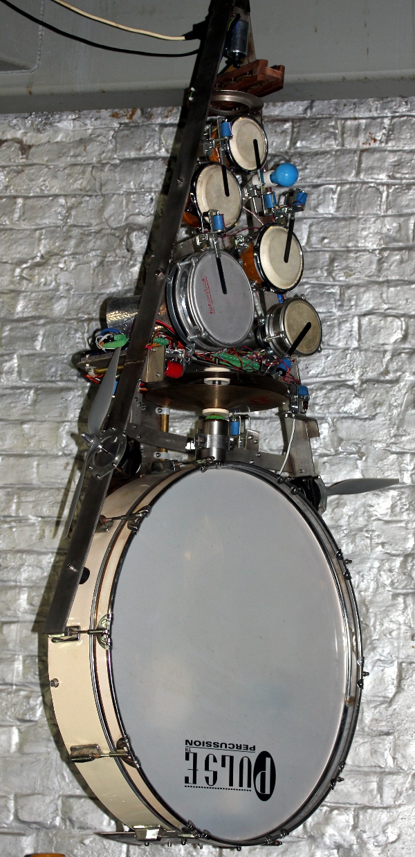 Calling this robot a 'flying' drum kit is a bit of an exaggeration. However, we did equip it with two motor driven propellers such that it is in fact capable of making gentle moves and swings when suspended on its hook. The motors are speed limited as we wanted to avoid serious accidents and injuries. The maximum speed is now ca. 1400 rpm whereas in order to develop substantial thrust, it ought to be at least some 8500 rpm. The propellers used are spare parts made for model aircraft's. The motors stem from an old professional Truvox reel-to-reel tape recorder.