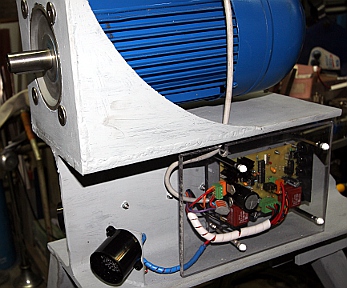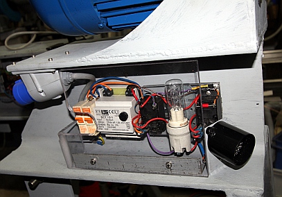 As we did not find enough space on the board to accomodate a 2.2mF / 450V electrolytic as originally foreseen in the schematic, we mounted a 470uF/400V type. If a larger value is required it will have to be added off-board. The motor brake relay as well as the braking resistor (or light bulb) should be mounted on the motor itself. As parts of the PCB are directly coupled to the mains voltage a word of warning may not be misplaced here: this board does carry high voltages! Do not touch. There is galvanic isolation between input and output, so using the circuit involves no danger. The steel structure itself is properly grounded.There are two automatic fuses on the machine making it possible to cut all power, however these fuses should not be used as a switch taking into account that being in such close proximity to the propeller entails a danger in its own, For safety reasons we advise users to use a switch in the power wire at least 5 meters away from the engine.
