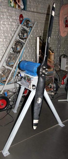 This is a rather small propeller, span 660 mm (26"), carved from wood. The motor used here is a DC motor, making precise control relatively easy. The motor rotation is transmitted to the propeller axle with a V-belt. The gear ratio can be changed by mounting different pulleys. An adaptor piece was turned on the lathe to make the propellers central hole fit the axle. This was fabricated from a piece of nylon, outer diameter 30.0 mm, inner diameter 14.5 mm, length 45 mm. The propeller axle is mounted on a steel holder made from a piece of HEA 100 x 100 profile. The axle is mounted on this part with four M10 x 35 bolts. The motor base -in construction steel as well- is cut out from a 450 mm long piece of 100 x 50 x 4 rectangular profile, also serving as a resonator. At the back end of this tubing, we constructed an acoustic horn to amplify the sound in the 80Hz to 130Hz range. The horn is folded, with the opening pointing to the audience. This yields a quite convincing airplane sound, although below the sound pressure level of a real prop-engine.The motor power was calculated to stay below 10% of the nominal power required for use on an airplane (estimated at some 5 to 8 kW). The whole structure was firmly welded together.