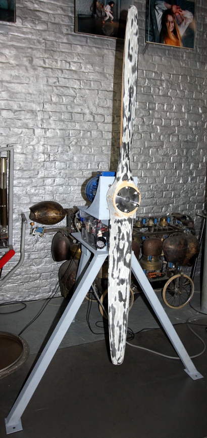 George Antheil (08.07.1900 - 12.02.1959) was a great admiror of the futurists ideas. Hence he introduced quite a variety of industrial noises in his orchestral music. The ballet mecanique, a ballet for machines, prescribes no less than three airplane propellers on stage together with a battery of seven industrial electric bells, some 16 player pianos, a siren and percussion. It was written between 1923 and 1924. All too often, orchestras performing this music fake these essential components either by subsituting them with percussion instruments, or even worse, by sampled sounds reproduced on loudspeaker channels. Needless to say that this goes against the composers original intentions, although during his entire lifetime he never got these components working as conceived. Just like Igor Strawinsky in his original version of Les Noces, he even never got the player piano's to play in sync... Nowadays it ought to become possible to realize all those ancient dreams, even though the composer during his lifetime has compromised his own ideas on many occasions. In some performances of the Ballet, large fans have been used and -as these devices are pretty noiseless- the composer had the players hold sticks against the blades... This clearly doesn't lead to anything like an airplane sound However, having working real airplane propellers on stage was and still is, not a trivial undertaking. The construction of these elements, such that they can safely be used in performances, was confined to us as a collaborative project with the Ictus ensemble.