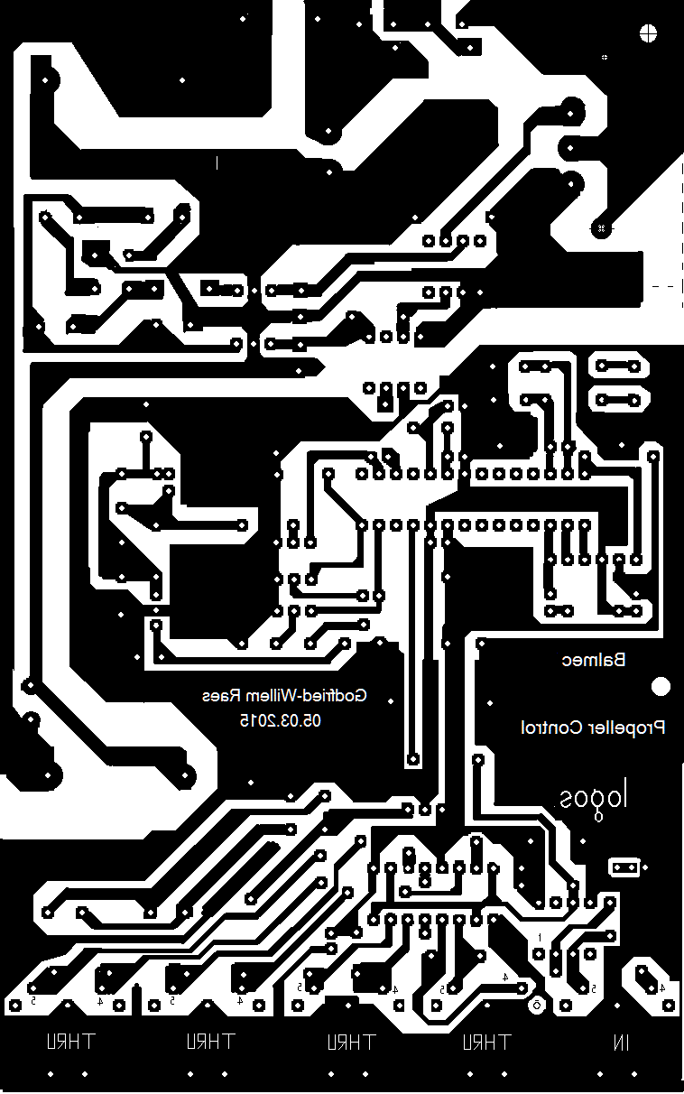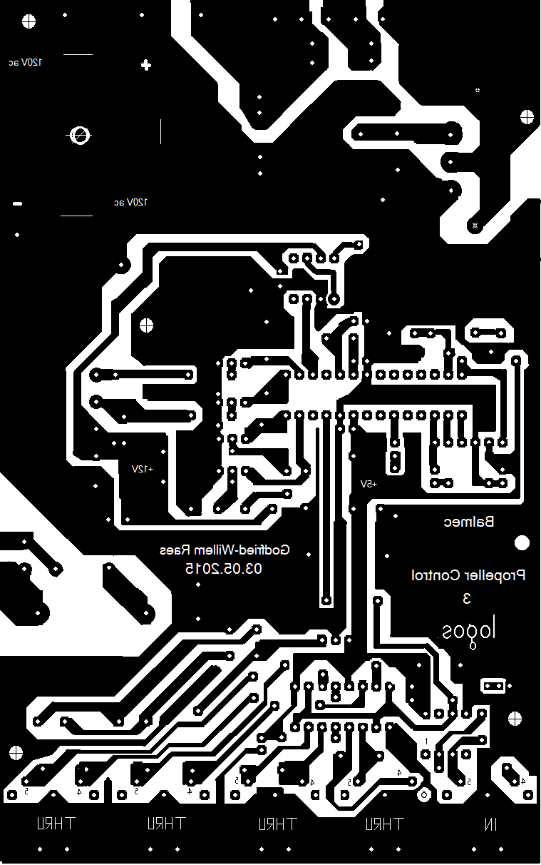- 06.05.2015: New version 3 board drawn, etched, drilled and soldered for propeller 3. Isolation transformer mounted underneath the propeller H-beam. Firmware simplified. No braking on slowdown now. This is the new board: