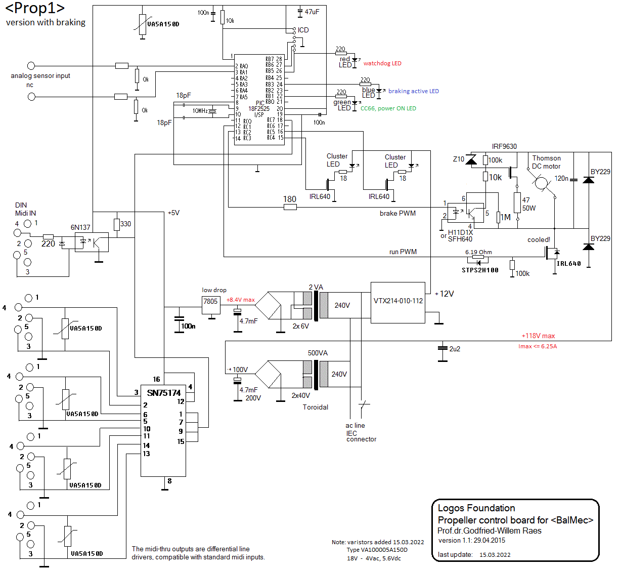The electric control of the propeller is not as easy as it might seem. As long as we only have to cope with very slow changes of rotation speed, we can live with just variable voltage control on the motor. However, if we want relatively fast braking, we have to deal with the problem that the motor -due to the inertia of the propeller- will become generative. This imposes the use of braking resistors and precise electronic control. Hence the PIC microprocessor (an 18F2525) needs two PWM controlled output channels: one for speed control, one for braking. Also the analog input channels can be used to monitor motor -and thus propeller- behaviour at all times. This is the circuit we designed for the MIDI control of the propeller: