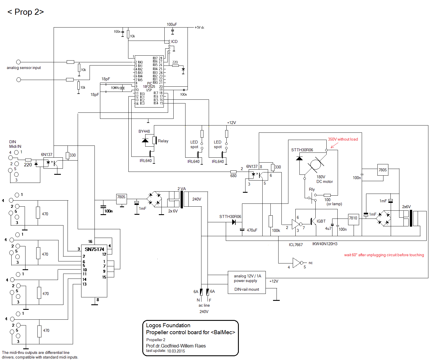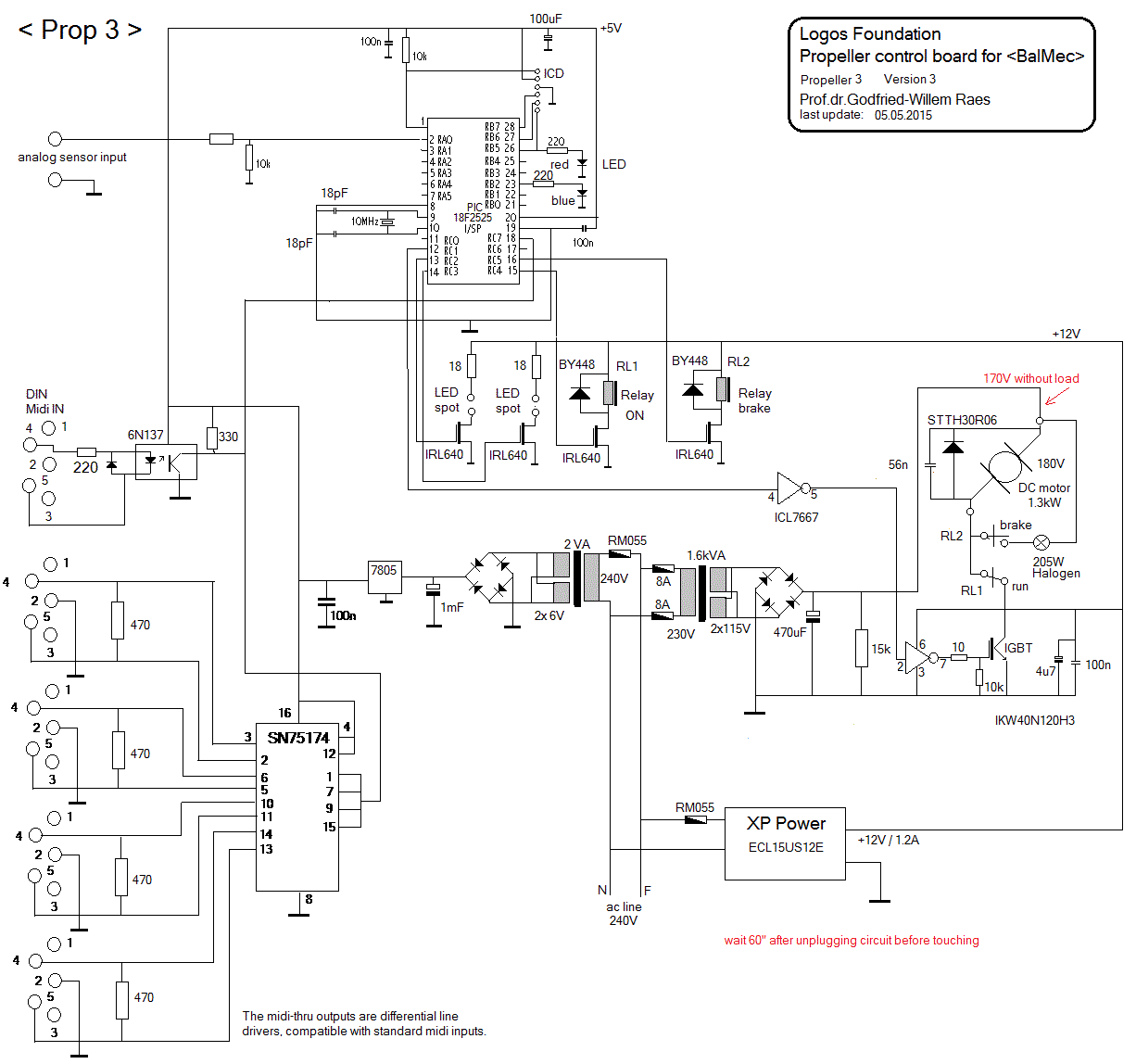 As we anticipate that in practical use, the distance between the different components of the setup might become relatively large, possibly exceeding the 5 to 10 meter limit for MIDI cabling, we provided in differential line drivers on all MIDI boards. With these, cables up to 100 meter in length can be used. For reliable performance, screened twisted pair cable should be used. DMX cable, properly terminated works very well.The firmware for the 18F2525 microprocessor can be found here: Propeller1.bas