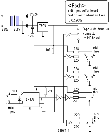 The midi in and buffer circuit is very straigthforward. We used a circuit board we had developed many years ago: