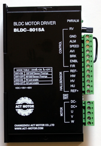 Een lange zoektocht naar geschikte controllers voor sinusoidale aansturing van BLDC motoren leverde geschikte types op gefabriceerd door Faulhaber (bvb. type MC5004P) ofwel een Chinees fabrikaat ACT Motor, type BLDC-8015A, verkrijgbaar bij het Duitse elektronikabedrijf Reichelt.