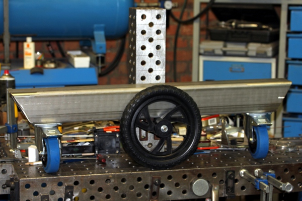 In het eerste exemplaar alvast 8 gaten 6.8mm geboord waarin we M8 schroefdraad tapten. Hiermee kunnen de montageplaten van de zwenkwielen worden vastgezet zonder moeren. 3 mm gaatje geboord aan de bovenkant voor het vastzetten van de netstroom IEC konnektor: een mannelijke ingang en twee uitgangen. Dit onderdeel heeft een ingebouwde vervangbare zekering.