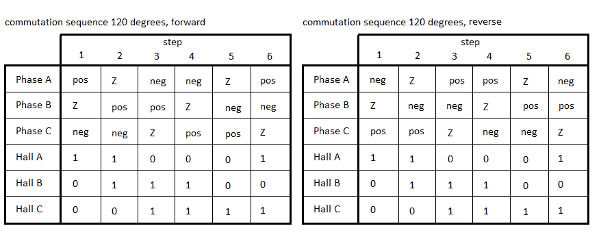 18.04.2025: De schakelsekwensen voor de driefazige brug waarmee de motor wordt aangestuurd moeten eruit zien alsvolgt:In de tabel is 'pos' de positieve helft van een met pwm opgebouwde sinus en 'neg' de negatieve helft. De positieve helft aktiveert de bovenste transistors of mosfets in de brug, de negatieve de onderste. Waar Z staat, is geen van beide transistoren geleidend.