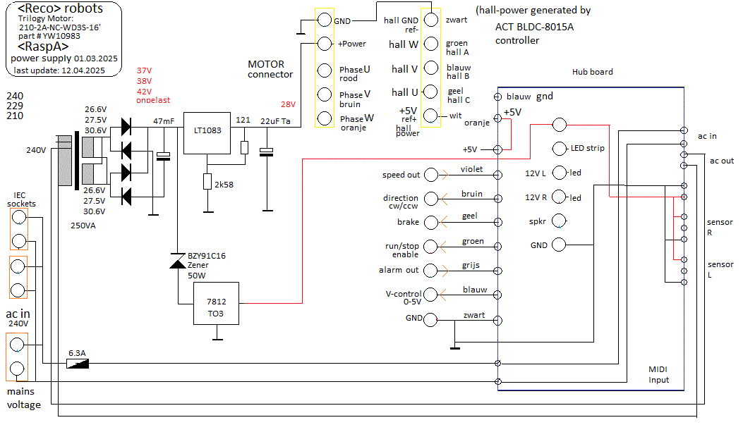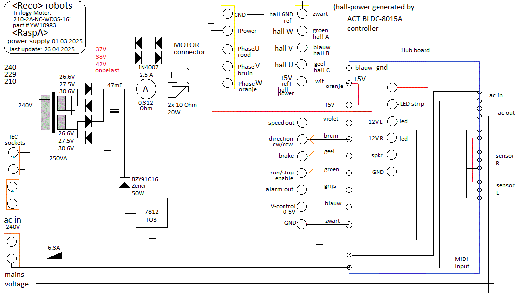 Noteer dat de hall sensors in omgekeerde volgorde aangesloten worden, overeenkomstig een hoekplaatsing van 240 graden.Twee pull-up weerstanden op de fault (alarm) en speed lijnen bleken wel nodig om alles weer aan de praat te krijgen. De voedingsschakeling is nu ook wel aan een herziening toe. De spanning is immers zowat 8 Volt te hoog. We kunnen natuurlijk een 'dikke' 4 a 5 Ohm weerstand in serie zetten, ofwel een LT1083 regulator gebruiken...