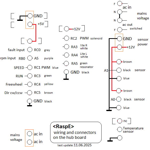 11.06.2025: Ontbrekende Weidmueller konnektors geleverd en meteen ingesoldeerd. Bedrading RaspE konnektors hub board, sensors, voeding, motor-kontroller.Board meteen ook van passende firmware voorzien.