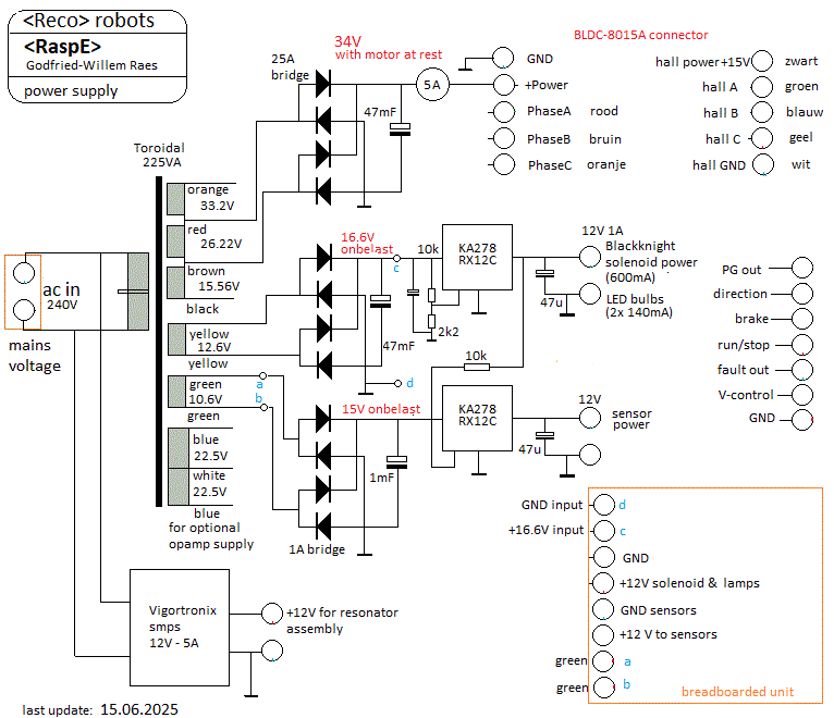 09.06.2025: Geen levering van Farnell vandaag, vanwege een of andere dwaze religieuze feestdag... Vigortronic 12V - 5A smps modules bij te bestellen. Het vermogen van de nog vrij beschikbare wikkelingen op de transfo blijkt onvoldoende om ook de versterkermodule te voeden.De voeding komt er nu zo uit te zien:Projekt gedemonstreerd voor Gamut Inc. , hier de hele week in residentie bij de robots.