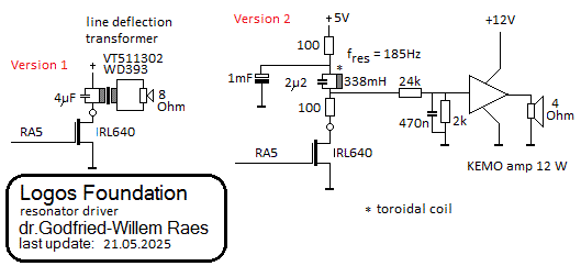 21.05.2025: De bestelde Teflon tape werd geleverd. Proeven met resonator schakelingen. Eerste proef met gestemde transformator -een oude lijnafbuigtransfo gebruikten we daarvoor- werkt maar levert onvoldoende vermogen aan de luidspreker. Voor een tweede experiment, gebruikten we een hoogwaardige toroidale spoel van 338 mH (dc weerstand 25 Ohm) in resonantie gebracht met een 2u2 bipolaire kondensator:De akoestische grondresonantiefrekwentie van het kokerprofiel ligt op 92.5 Hz (MIDI noot 42, F#3). De LC kring resoneert dus op de oktaaftoon.