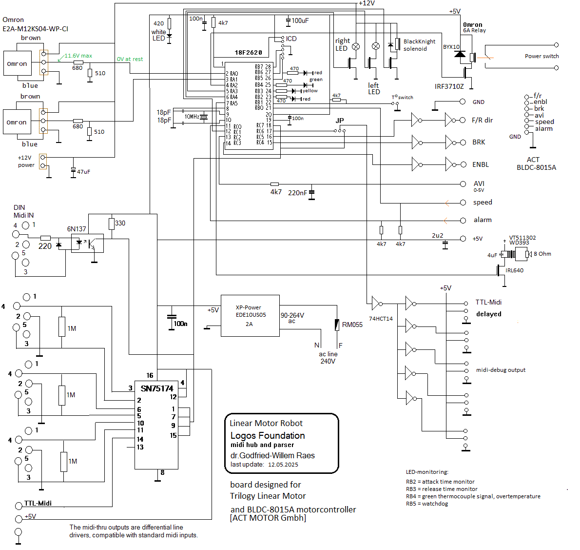 20.08.2025: Op de nieuwe PCB's hebben we klaarblijkelijk pull up weerstanden van 4k7 vergeten te voorzien op de pennen RB0 en RC0... Op print #3 meteen gekorrigeerd evenals op de print layout in 600 dpi (file PCB_Hub_linmot_V3.bmp). We monteerden 4k99 exemplaren. Ook op de RaspE print (print #2) voerden we dezelfde korrekties uit. Daarvoor dienden we wel alle konnektors los te maken... RaspE zou nu korrekt moeten werken. Te testen.