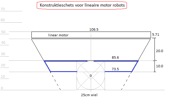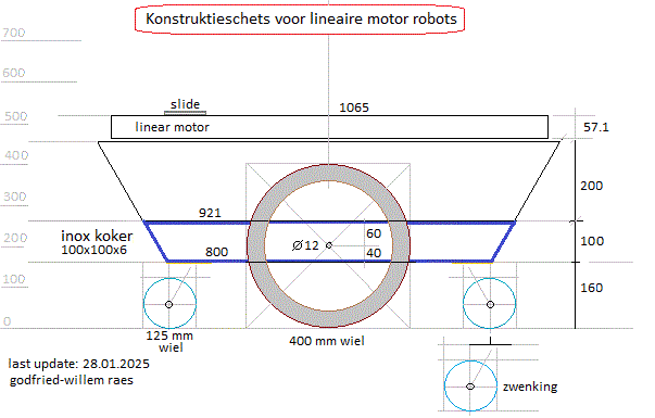 27.01.2025: De PG out uitgang van de Anaheim controllers zouden we kunnen gebruiken als excitatiebron voor een mechaniekje dat parallel zou kunnen lopen met alle bewegingen van de motor... Te onderzoeken dus. Verder werk aan de 100 x100 basisprofielen. De kobaltboortjes van Multicomp -Made in China en aangekocht bij Farnell- zijn volstrekt onbruikbaar. Rotzooi en totaal ongeschikt voor inox... Wielen besteld bij Kaiser en Kraft, 7-spakige wielen van 400 mm diameter: 8 stuks, totale kost 492,71- Euro. Schets met 400 mm wielen:De wielen -Tente fabrikaat, maar geleverd door Kaiser & Kraft, hebben wel een levertijd van twee weken...
