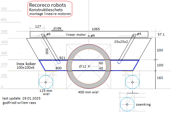 29.01.2025: Konstruktie van de steunen voor de lineaire motoren: vastzetten gebeurt met M4 x 50 boutjes, terwijl de onderkant van de onder een hoek van 60 graden geplaatste steunen vastgelast wordt op het zware kokerprofiel van de wielbasis. Voor de steunen zaagden we 8 stukken inox kokerprofiel 25 x 25 x 2. Aangepaste en verbeterde tekening:De keuze van de hier toe te passen sensoren voor de trajektbegrezing hebben we nog niet gemaakt. We onderzochten vele mogelijkheden, maar de meest wenselijke sensoren kunnen we ons -door onze ellendige subsidieringstoestand- niet veroorloven. Die kosten immers 100 euro per stuk en we hebben er alvast 8 nodig!