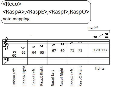 Elke rasp luistert naar twee diatonische noten. De eerste beweegt het stokje op de rasp initieel naar rechts, en tweede doet het stokje initieel naar links bewegen. Het velocity byte stuurt in beide gevallen de snelheid van de motor. Het trajekt wordt bepaald door de duur van de noot. Wanneer het einde van de rasp wordt bereikt keert de bewegingsrichting automatisch om. De beweging wordt gestopt bij ontvangst van een note-off kommando. Note-off met release is geimplementeerd en stuurt de vertragingstijd waarmee de slede tot stilstand komt. Note-off kommando's worden altijd uitgevoerd met een kort remtrajekt (50 ms). Tijdens deze rem-tijd zal de rasp niet reageren op nieuwe note-on kommando's. Tijdens de beweging van de rasp kan de bewegingssnelheid gemoduleerd worden met het key-pressure kommando.