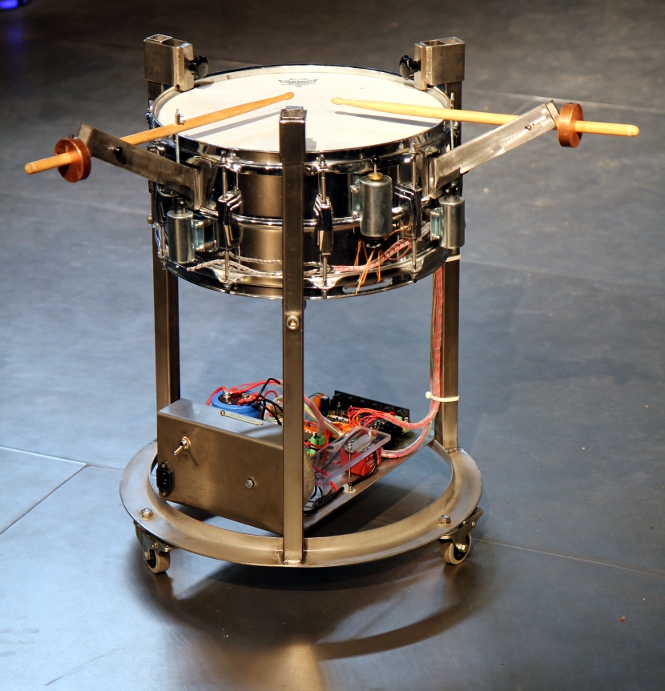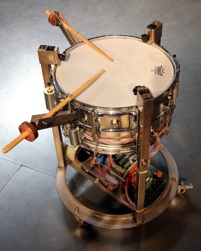 This musical robot consists of a high quality Ludwig snare drum automated with
